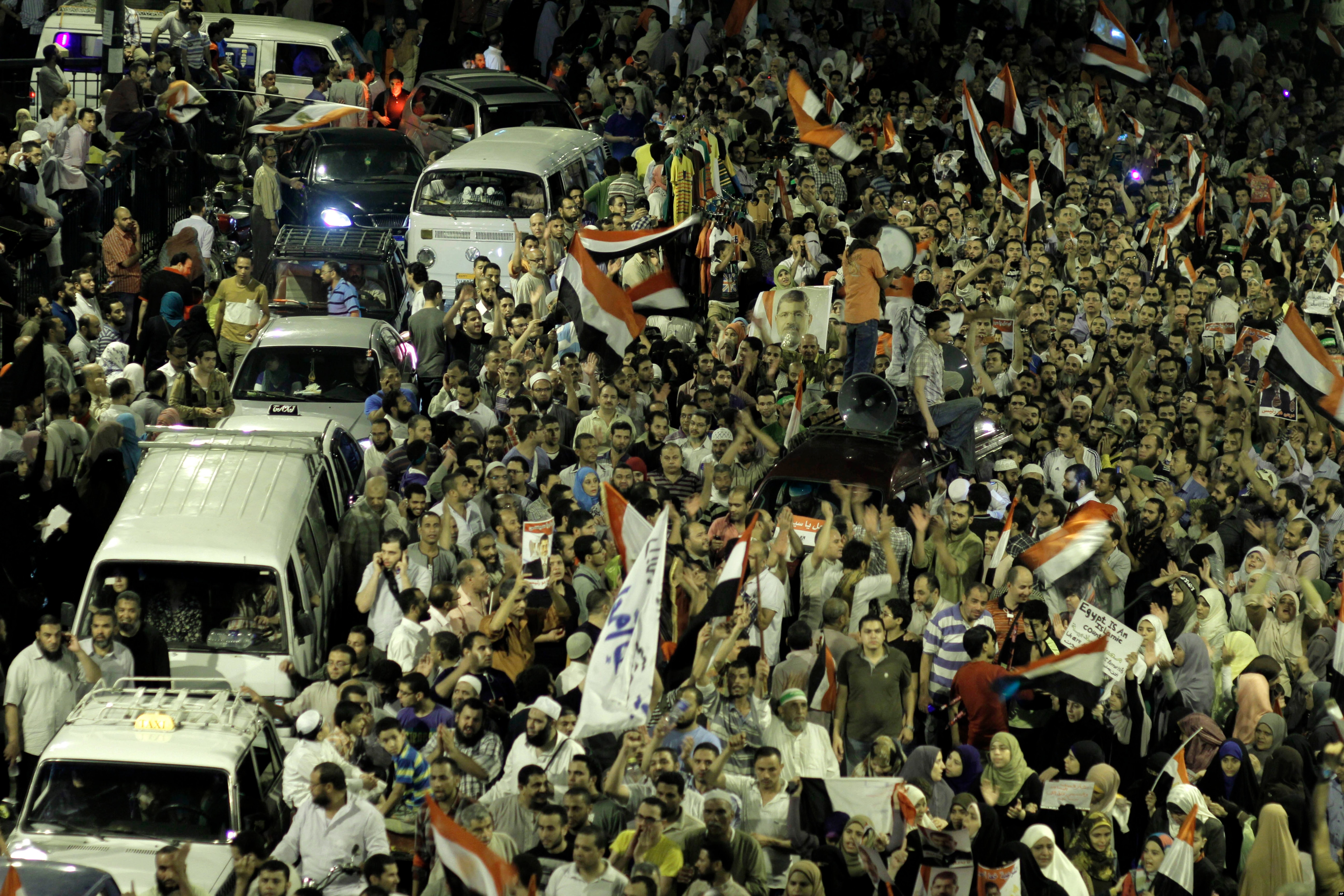 Supporters of Egypt's ousted President Mohamed Morsi block Giza square during a march near Cairo University, where protesters have been camped out, Cairo, July 15, 2013.