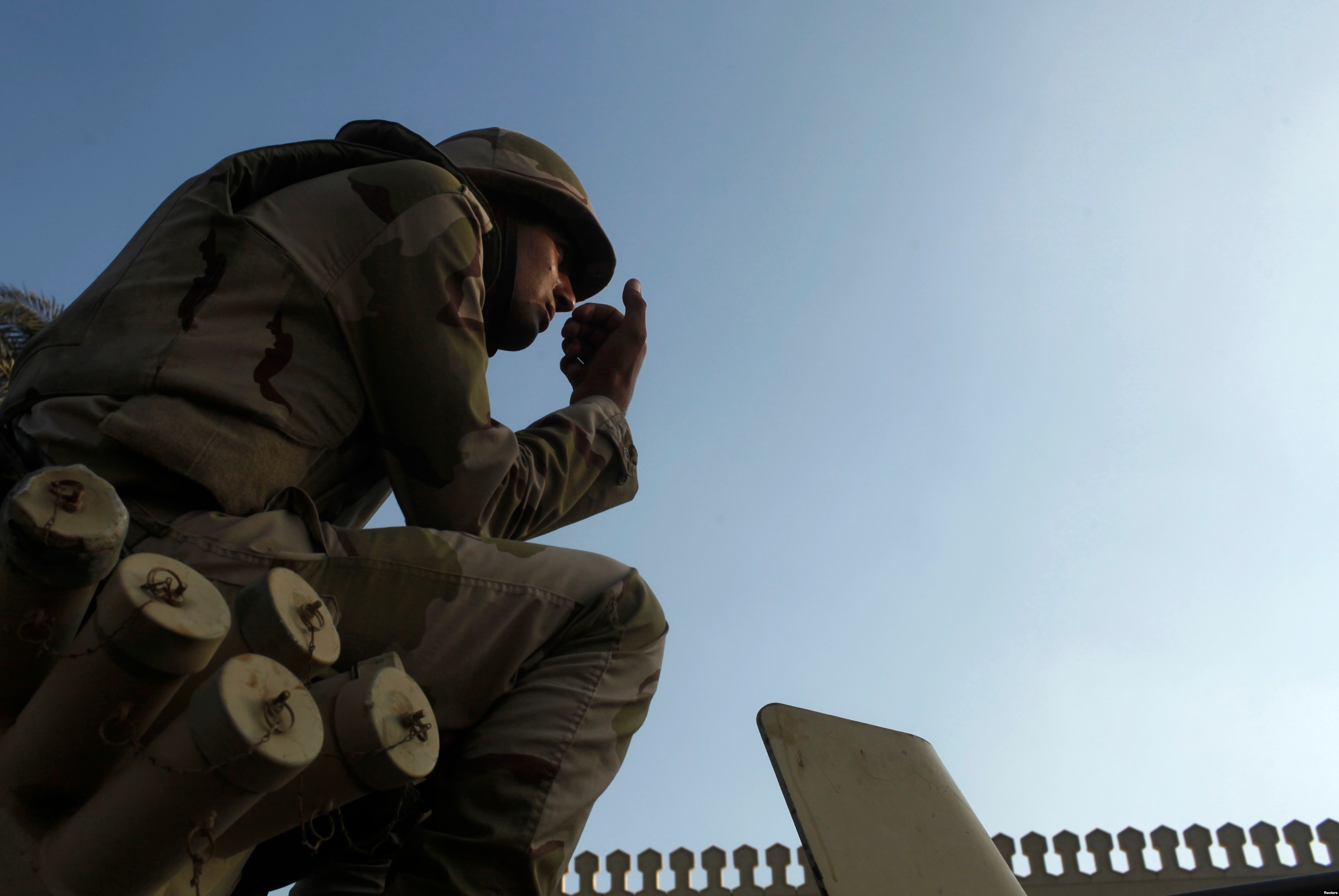 An Egyptian soldier keeps watch from atop a military vehicle in front of the presidential palace in Cairo, July 14, 2013.