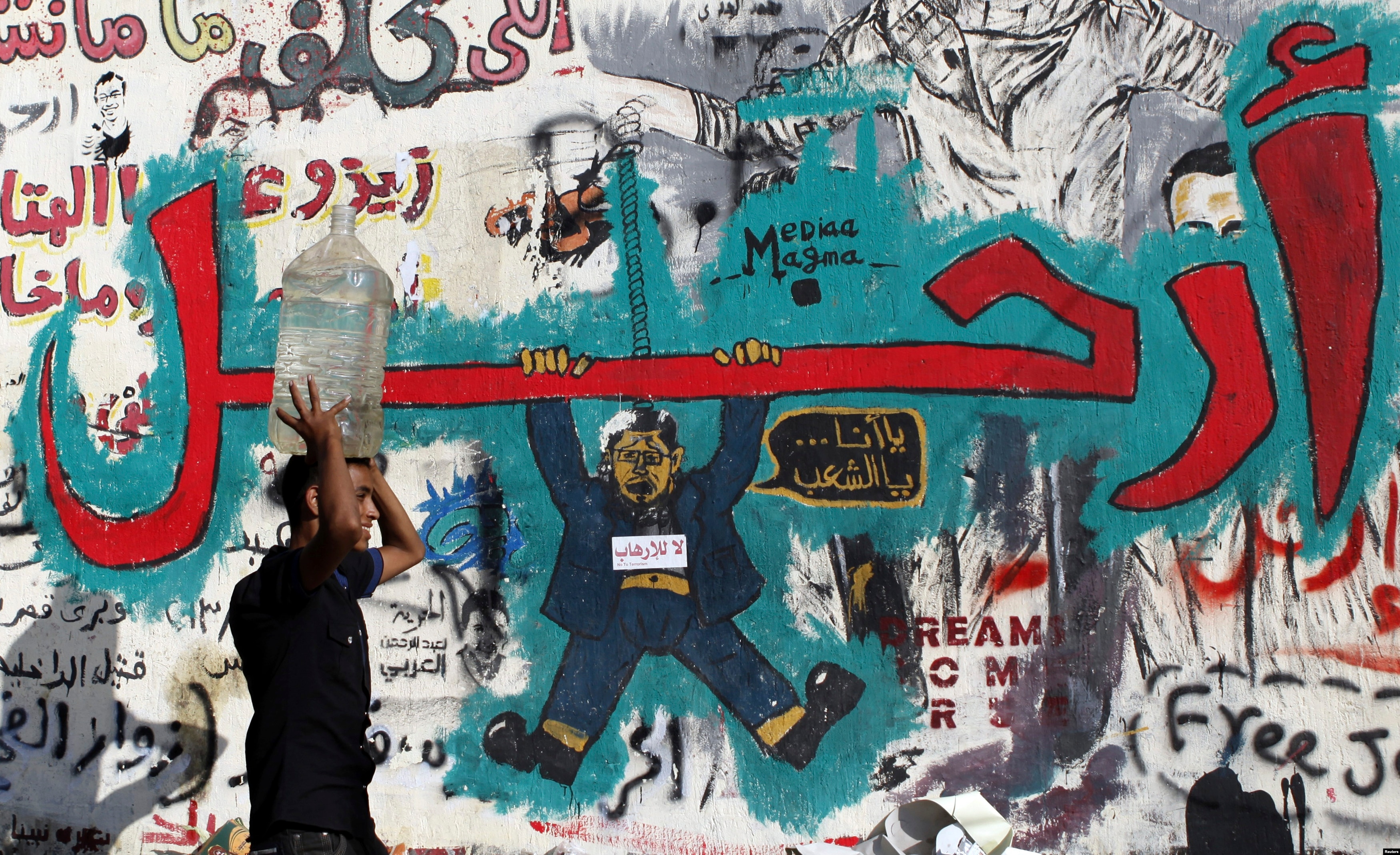 A man carrying a water container on his head walks in front of a wall filled with graffiti depicting deposed Egyptian President Mohamed Morsi with a message reading "Leave", at Tahrir Square, Cairo, July 14, 2013.