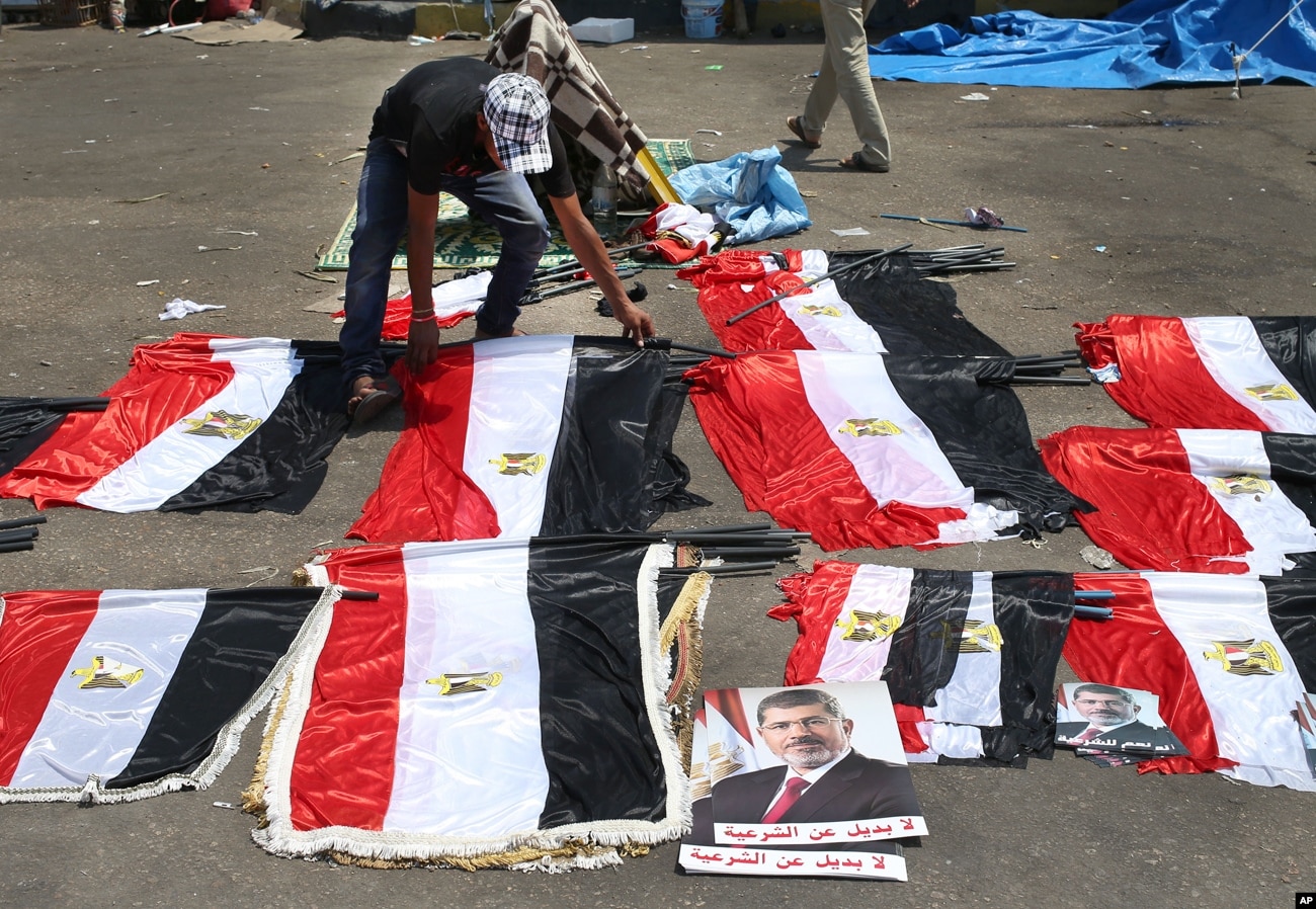 A Morsi supporter arranges flags for sale in Nasr city, Cairo, July 15, 2013.