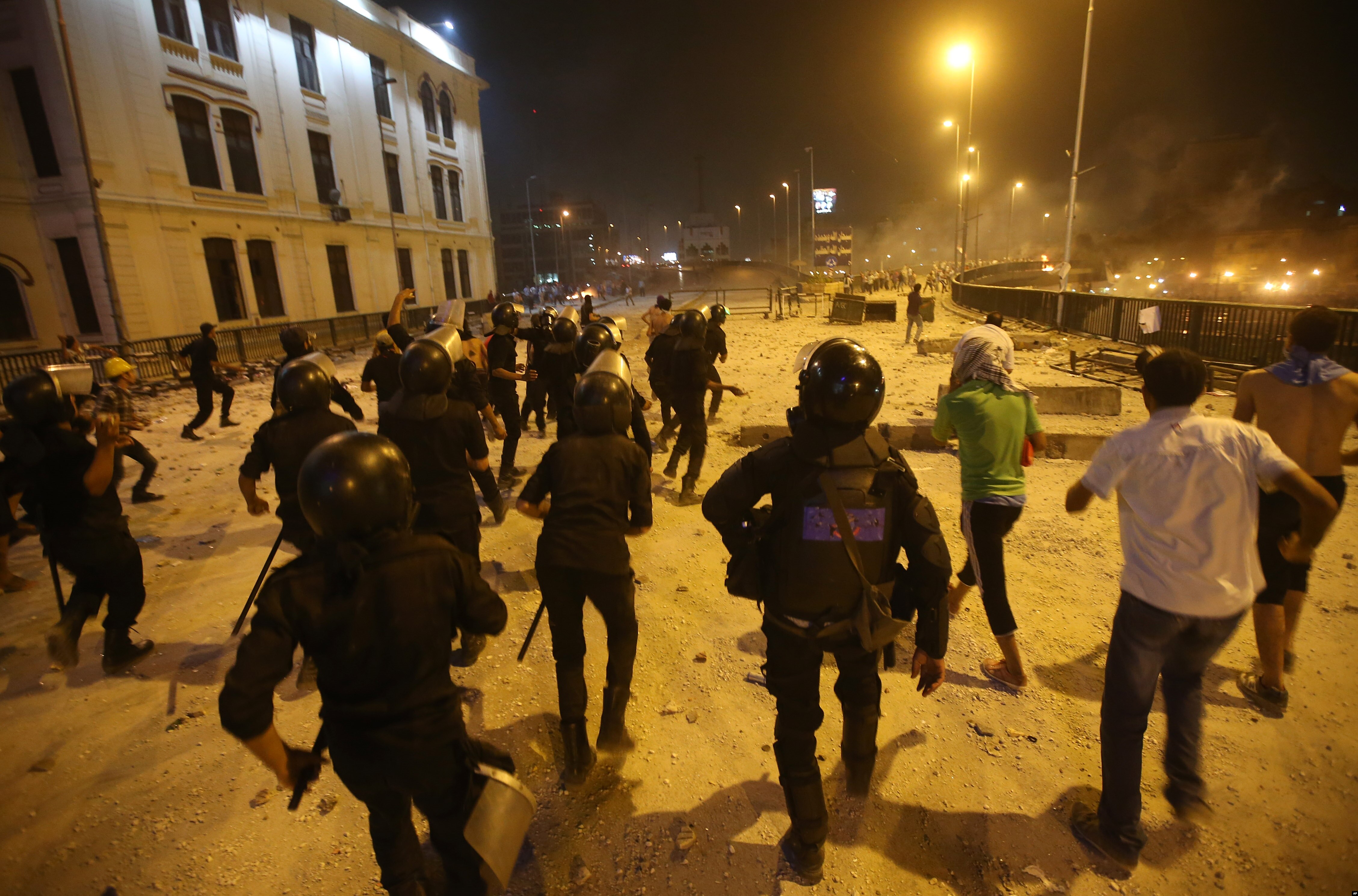 Egyptian riot police and opponents of ousted President Mohamed Morsi run towards pro-Morsi supporters, seen in the background, during clashes on a bridge in downtown Cairo, July 15, 2013.