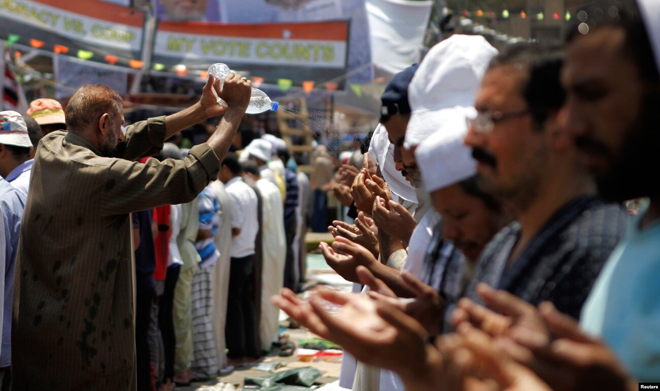 A member of the Muslim Brotherhood and supporter of ousted Egyptian President Mohamed Morsi cools people off during afternoon prayers at the Rabaa Adawiya square in Cairo, July 15, 2013.