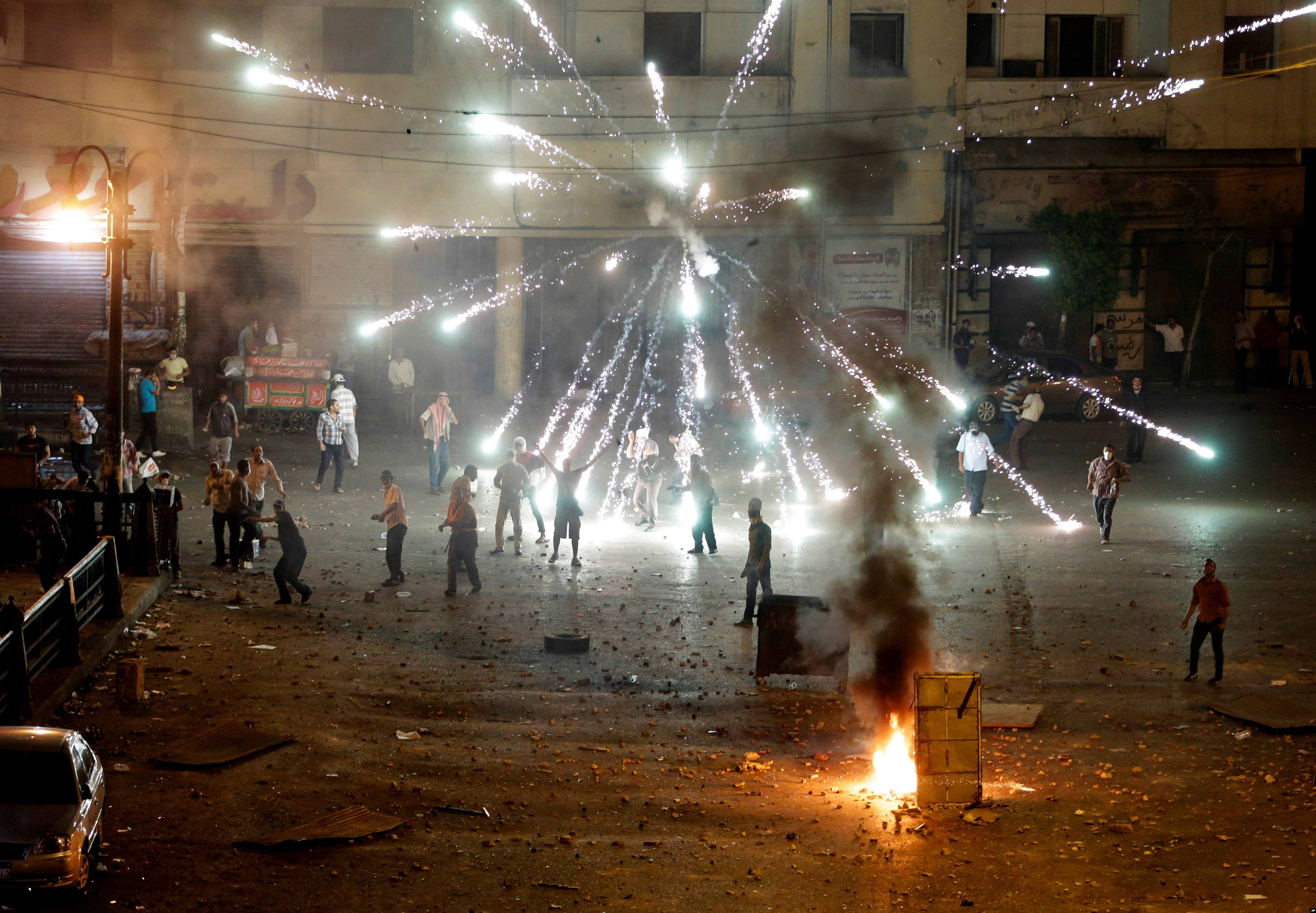 A firework fired by opponents of ousted President Mohamed Morsi explodes during clashes in downtown Cairo, July 15, 2013.