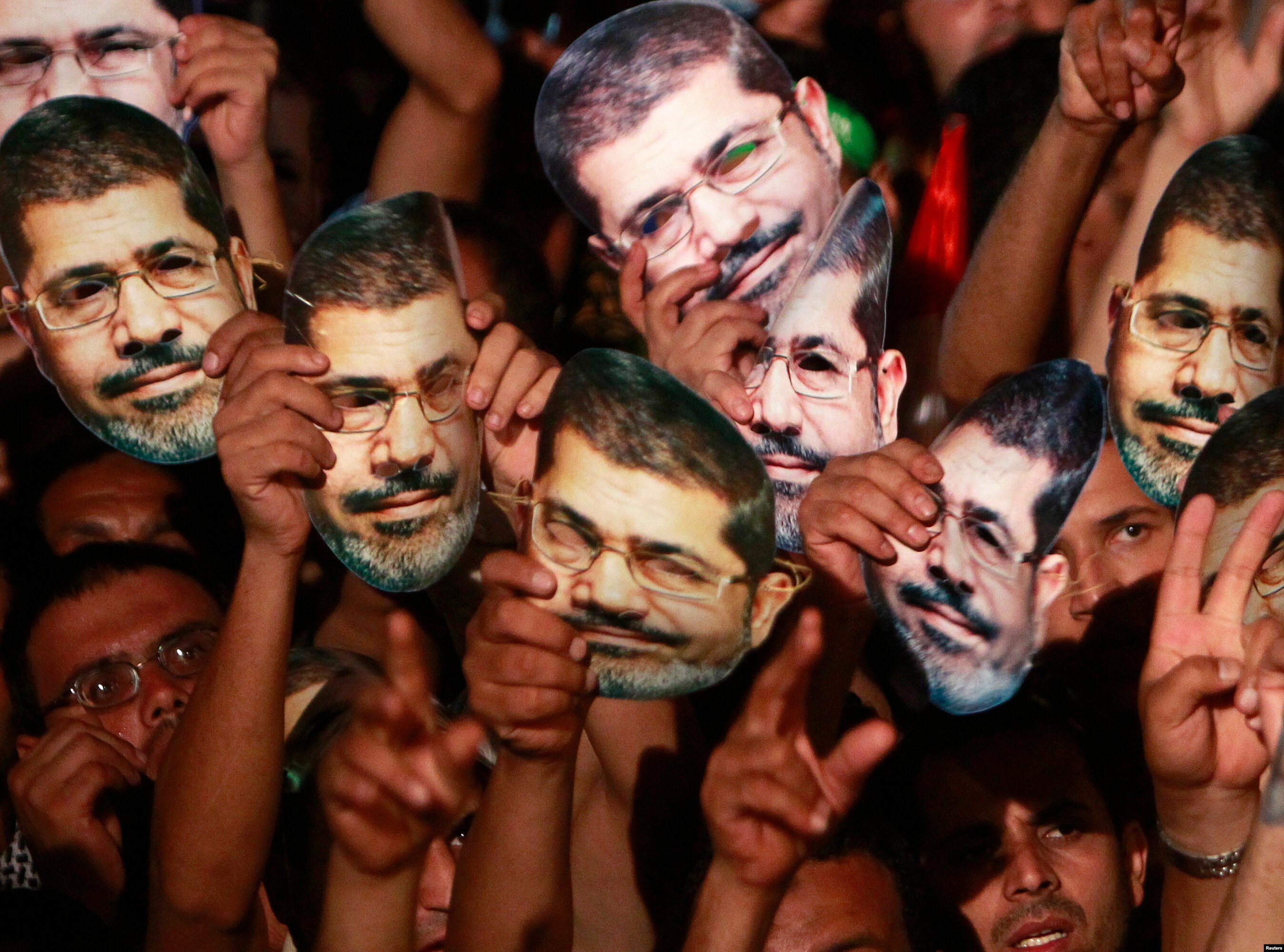 Members of the Muslim Brotherhood and supporters of deposed Egyptian President Mohamed Morsi hold up masks of him as they gather at the Rabaa Adawiya square, where they are camping, in Cairo, July 13, 2013.