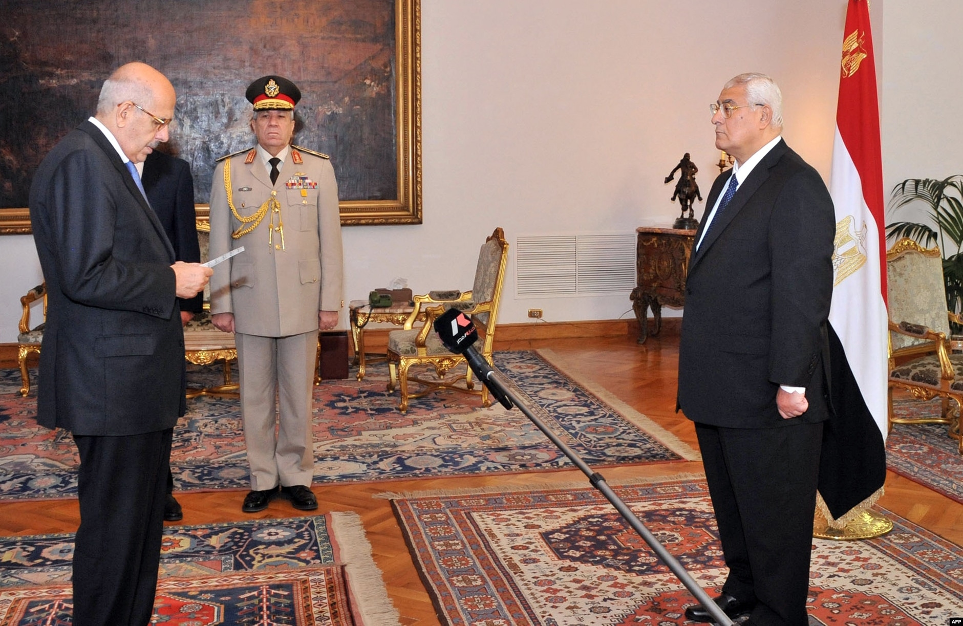 This handout photo shows Mohamed ElBaradei being sworn in as Egypt's interim vice president for foreign relations, in front of Egypt's interim president Adly Mansour, Cairo, July 14, 2013.